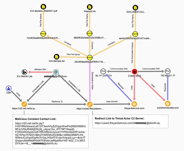 These URLs yielded a set of corresponding URLs generated by the Constant Contact email marketing software. One of the Constant Contact URLs results in a HTTP 302 redirect to https: //usaid . theyardservice . com/d/<emailAddress>, where <emailAddress> is the final parameter value in the Constant Contact URL and the link's recipient. The C2 server responds with a 21 kilobyte ISO file named ICA-declass.iso.