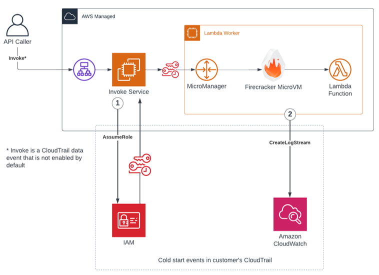 - AWS顧客が定義したLambda Identity Access Management(IAM)実行ロールが、関数呼び出しサービスに対してAWS STSの認証情報を要求した時点でAssumeRoleイベントが記録されます。このイベントが実行ライフサイクルのどのタイミングで発生するのかは不明ですが、当社CTUの分析では、Lambda Workerの初期化前に発生していました。